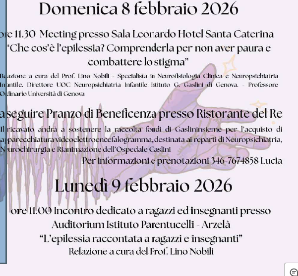 Iniziativa dedicata alla Giornata Internazionale dell'Epilessia 8 e 9 febbraio 2026, con la partecipazione del Prof. Nobili, primario del reparto di neuropsichiatria infantile dell' Ospedale Gaslini di Genova, domenica 8 febbraio convegno pubblico dedicato alla cittadinanza presso la Sala Leonardo del Santa Caterina Hotel, con interventi di carattere divulgativo e informativo, lunedì 9 febbraio mattinata formativa rivolta agli studenti e ai docenti dell' Istituto scolastico Parentucelli Arzelà, con attività dedicate alla conoscenza e alla sensibilizzazione sull'epilessia.